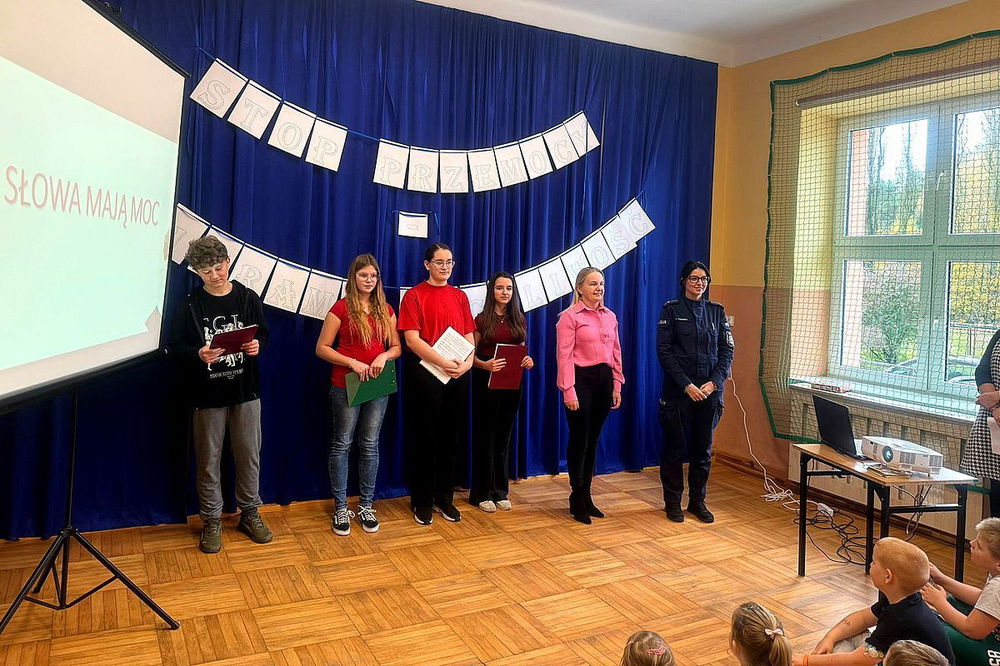 Wczoraj 27.10.2025 uczniowie zaprezentowali przedstawienie i scenki obrazujące różne formy przemocy oraz sposoby reagowania. Policjantka z lipnowskiej komendy, zajmująca się profilaktyką społeczną i sprawami nieletnich, wygłosiła prelekcję na temat przemocy rówieśniczej i przemocy ze strony dorosłych oraz sposobów szukania pomocy.